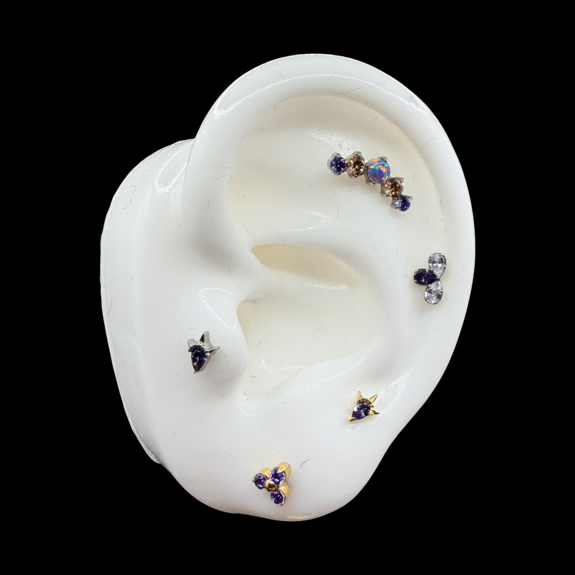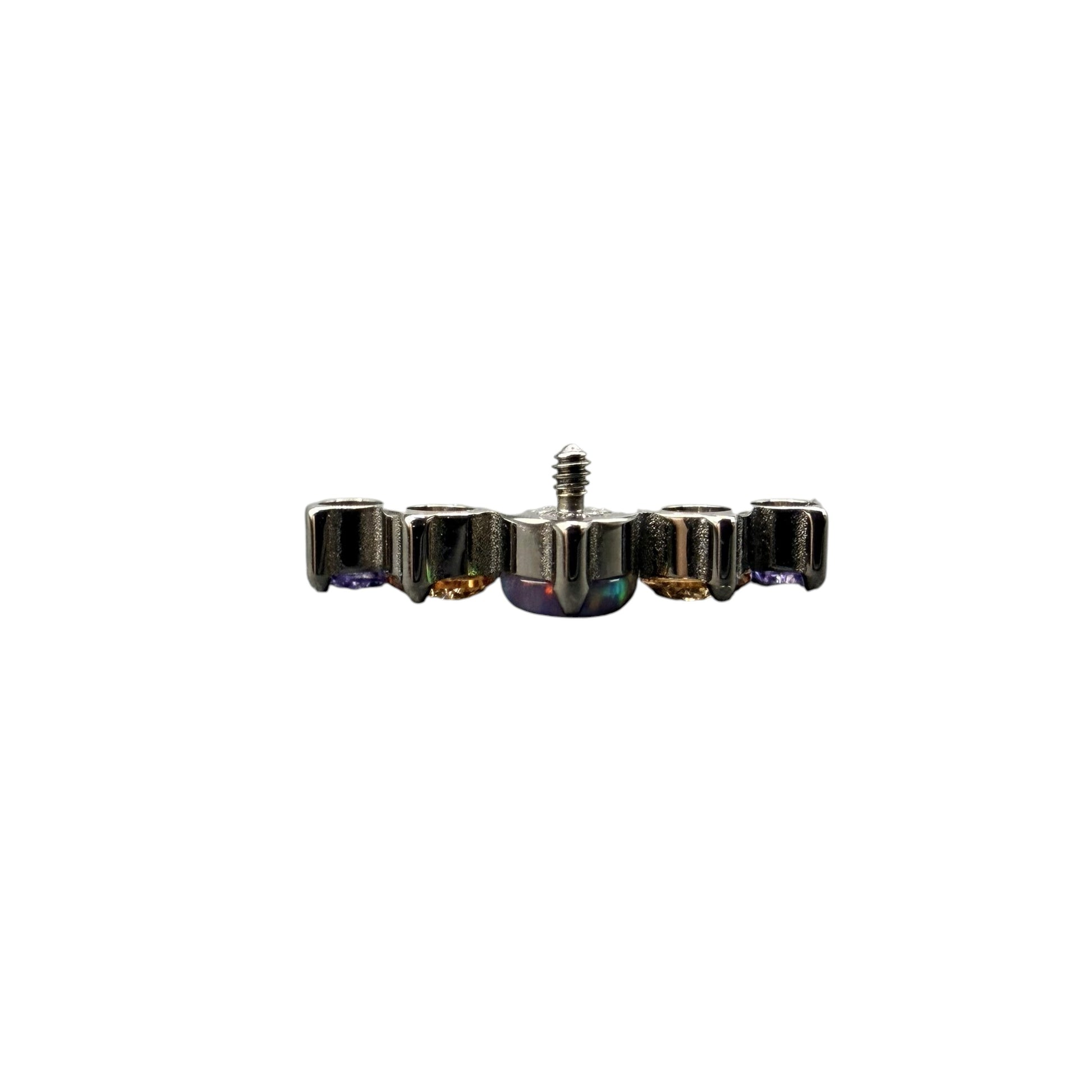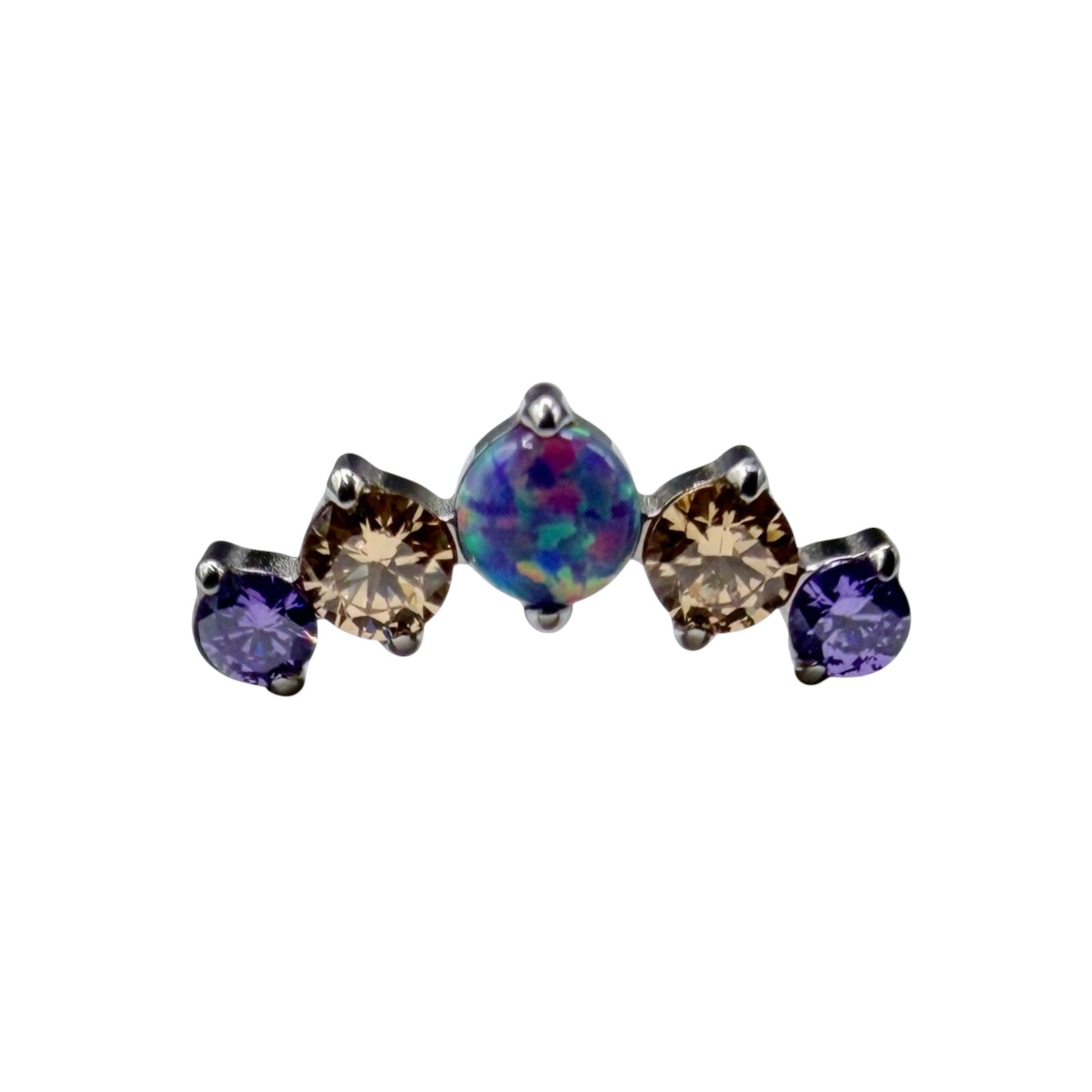 Topo de rosca 16G em Titânio Natural de rosca de 16G (1.2mm) com duas zircônias ametista, duas zircônias champagne e uma opala violeta no centro.