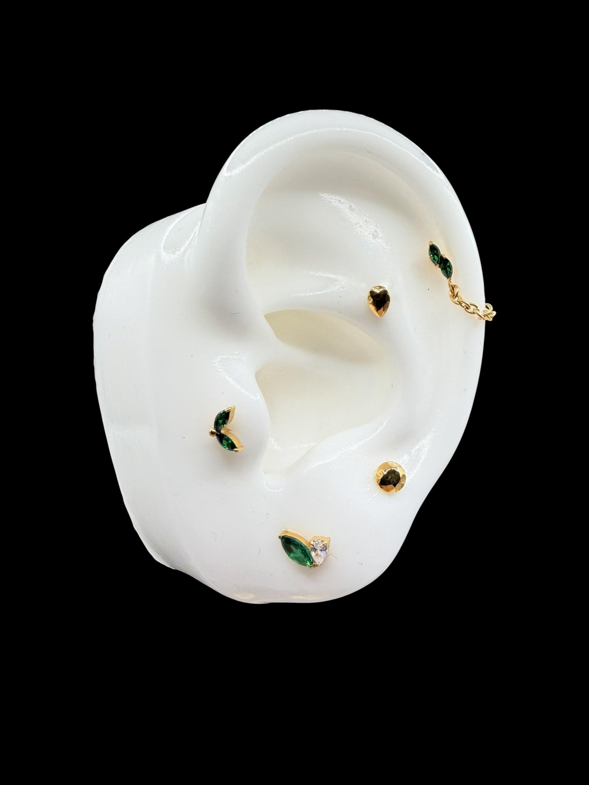 Topo Cluster Duplo em Titânio Natural de encaixe Treaded ( Rosca Interna) 16G ( 1.2mm), composto por duas pedras em forma de gota, uma em verde esmeralda e uma clear.