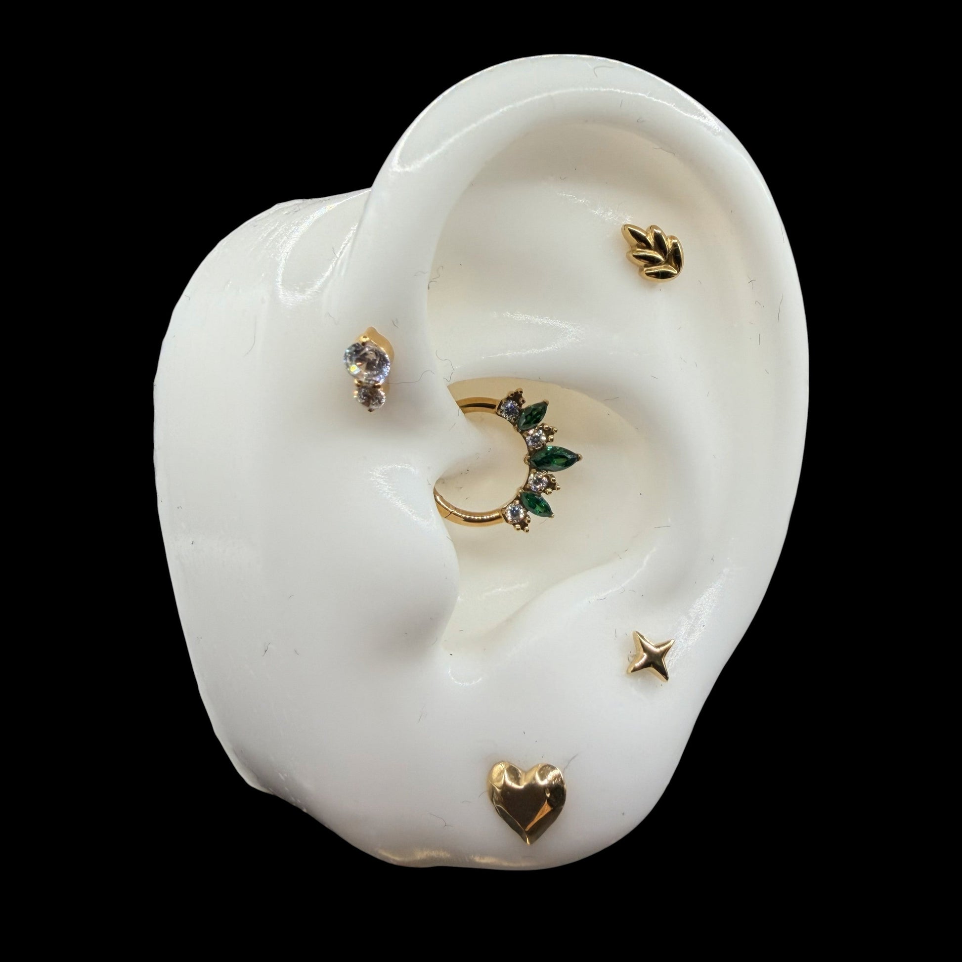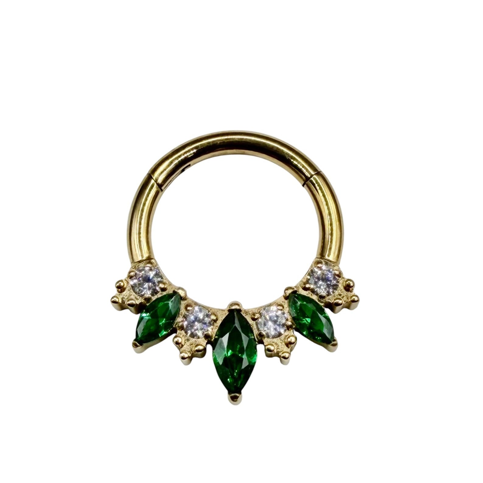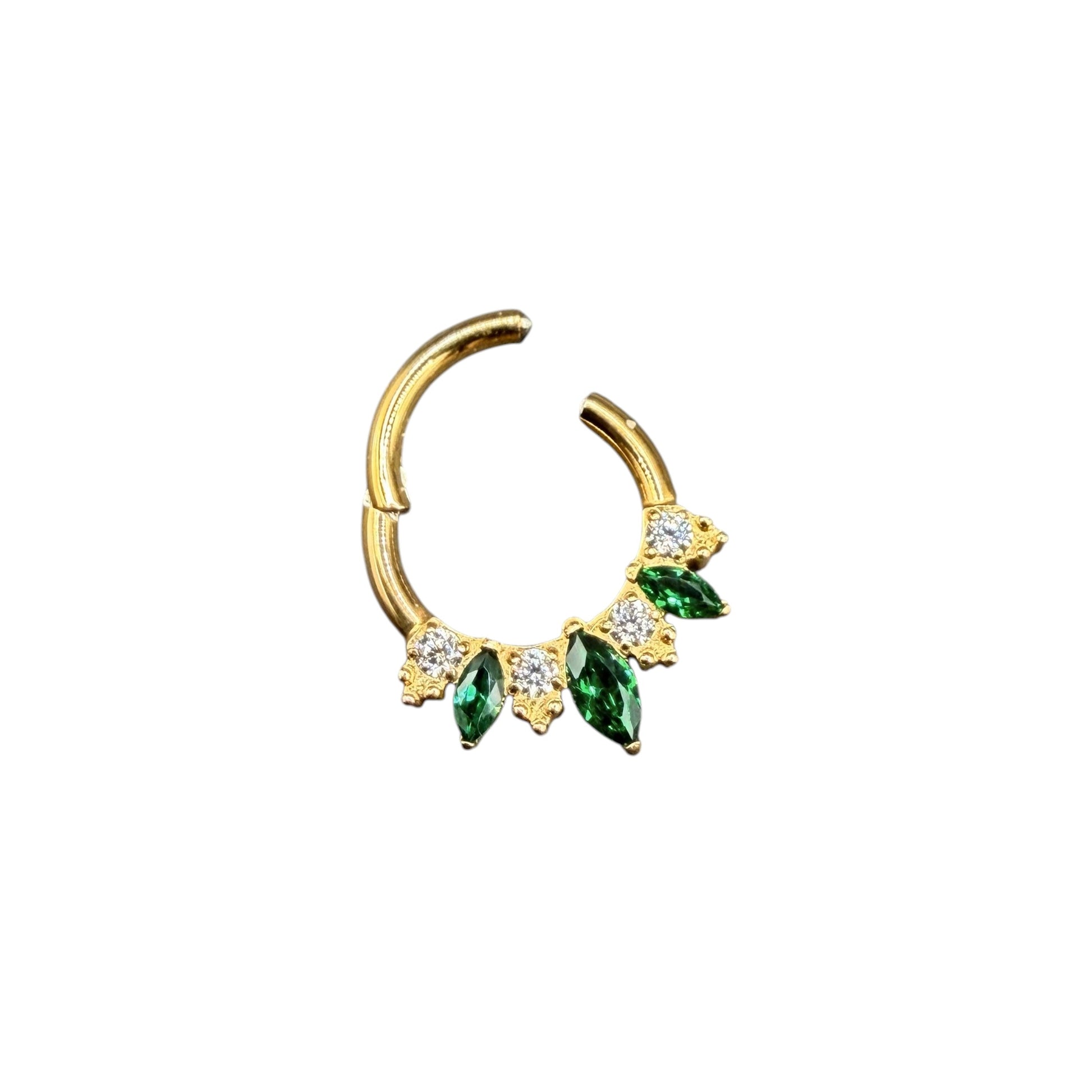 Argola segmentada clicker em Titânio PVD Gold com quatro zircónias clear de um mm, e três zircónia pétala verde esmeralda.