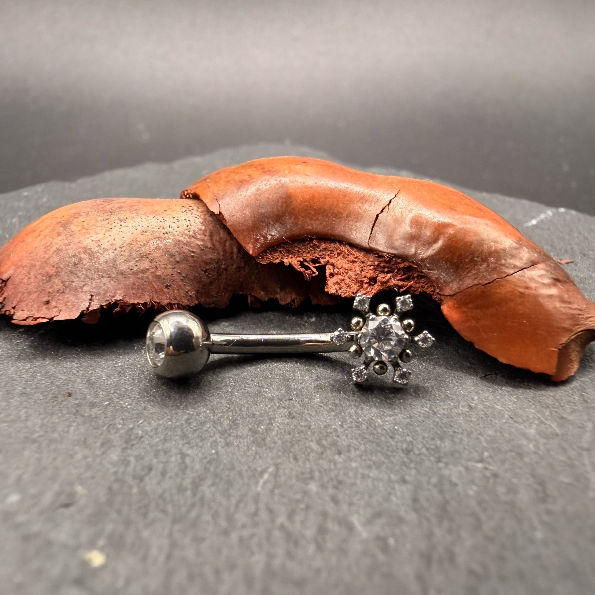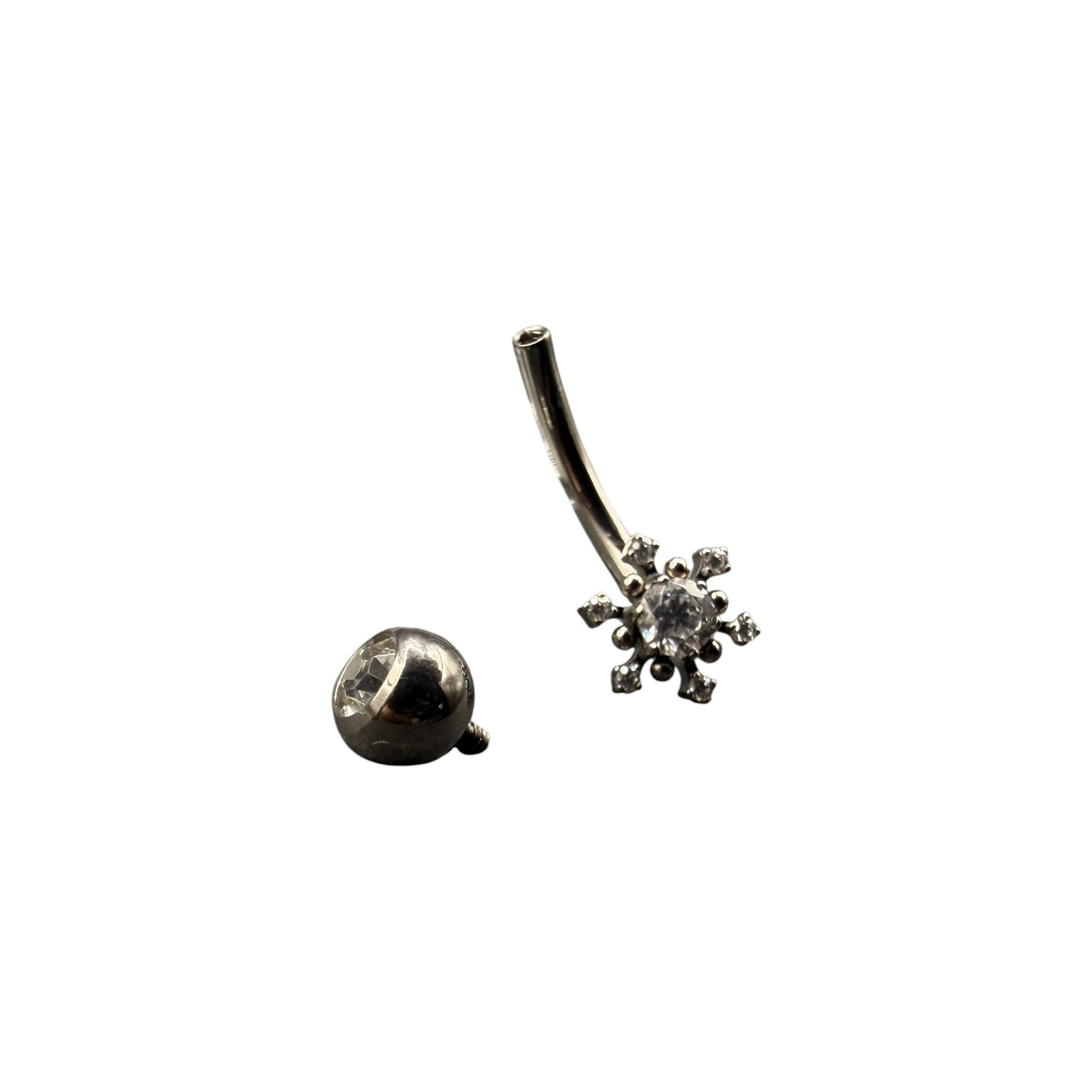 Navel Piercing em Titânio Natural e Titanio PVD Gold de rosca Treaded 14G (1.6mm), composto por bola de 5mm com zircônia e um floco de neve com zircónia de 4mm no centro e 6 zircónias de 1mm.