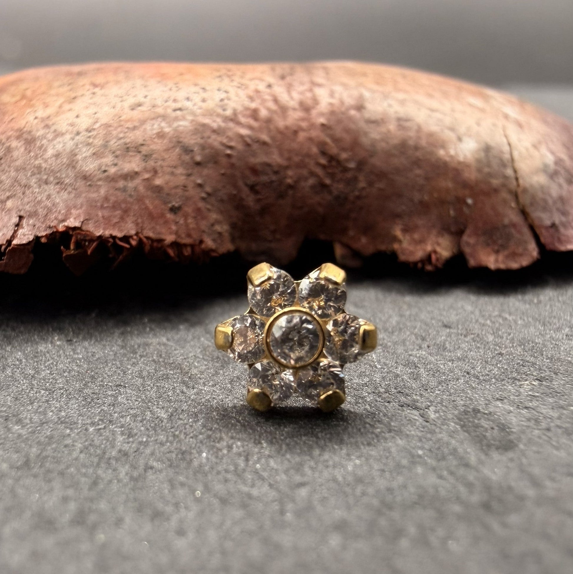 Topo de encaixe threadless em Titânio PVD Gold composto por seis pétalas com zircónias de 1mm cravadas e uma zircónia no centro.