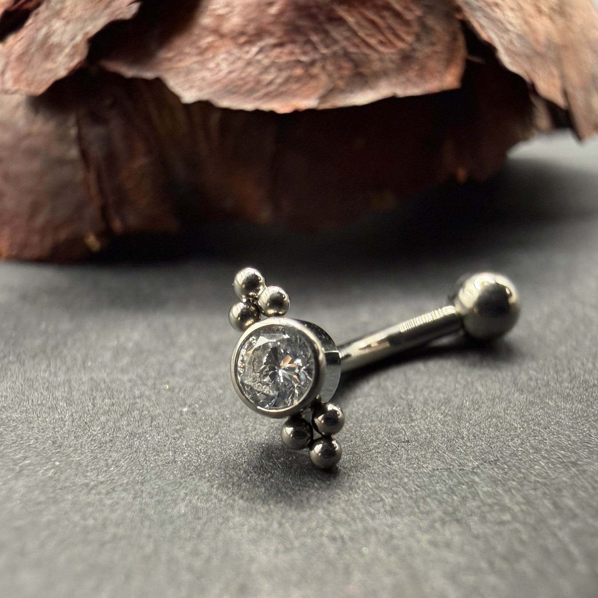 Mini Barbel de encaixe Treaded 16G ( 1.2MM) em Titânio Natural composto por mini Cluster com zircónia e bola simples .
