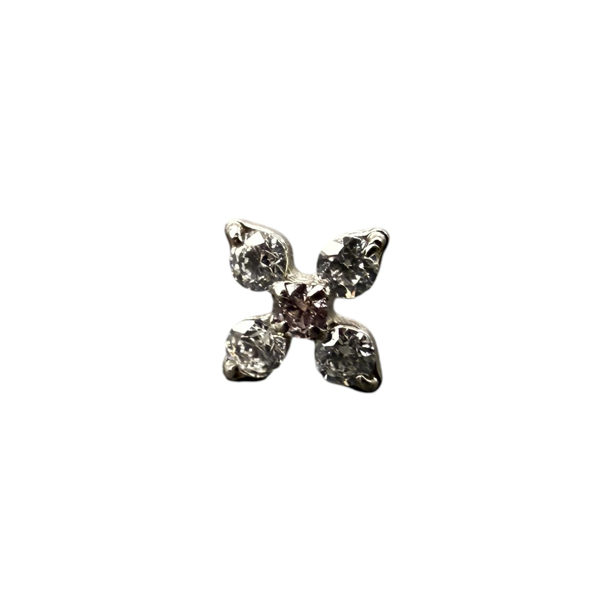 Flor em Titânio Natural e Titânio Pvd Gold de encaixe Threadless, composta por quatro zircónias clear e uma zircónia ametista no centro.