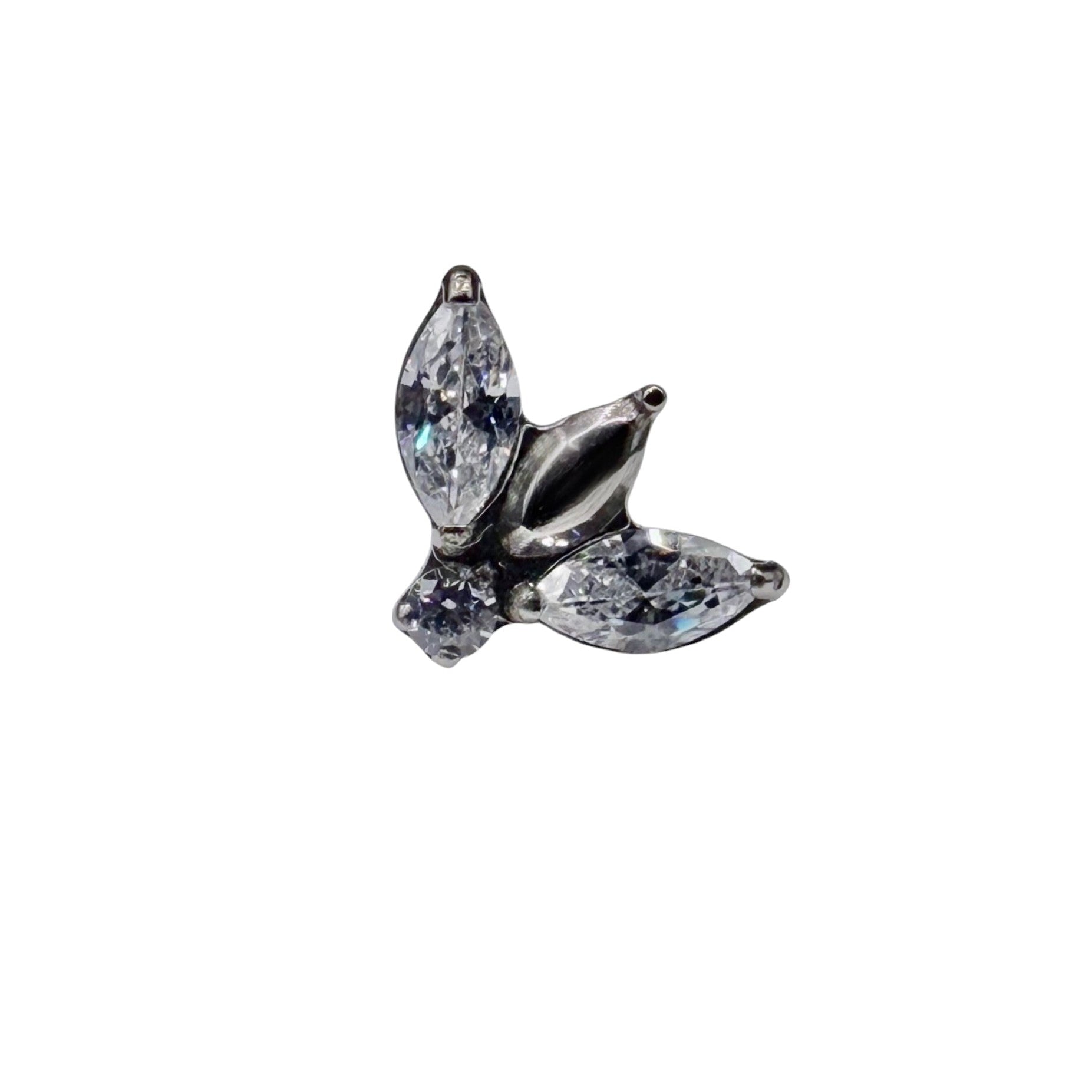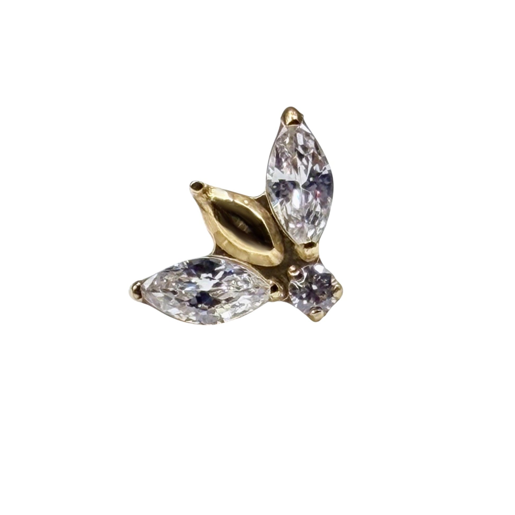 Topo Threadless ( push pin) em Titânio Natural e Titânio Pvd Gold composta por duas zircónias em forma de pétalas e uma zircónia em forma de pétala de titânio Pvd no centro, zircónia de 1mm no centro em baixo.